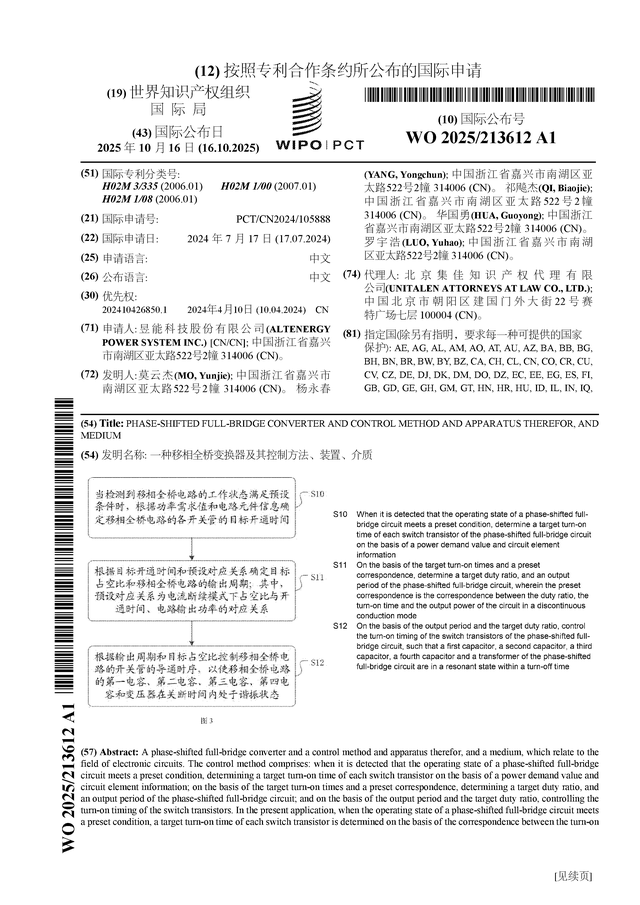 证券之星消息,根据企查查数据显示昱能科技(688348)公布了一项国际专利申请,专利名为“一种移相全桥变换器及其控制方法、装置、介质”,专利申请号为PCT/CN2024/105888,国际公布日为2025年10月16日。