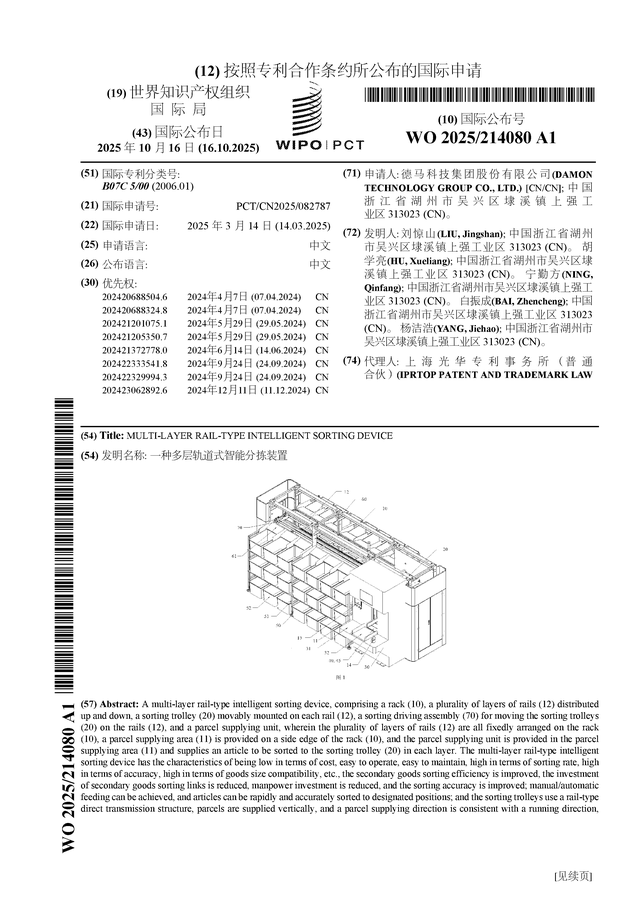 证券之星消息,根据企查查数据显示德马科技(688360)公布了一项国际专利申请,专利名为“一种多层轨道式智能分拣装置”,专利申请号为PCT/CN2025/082787,国际公布日为2025年10月16日。