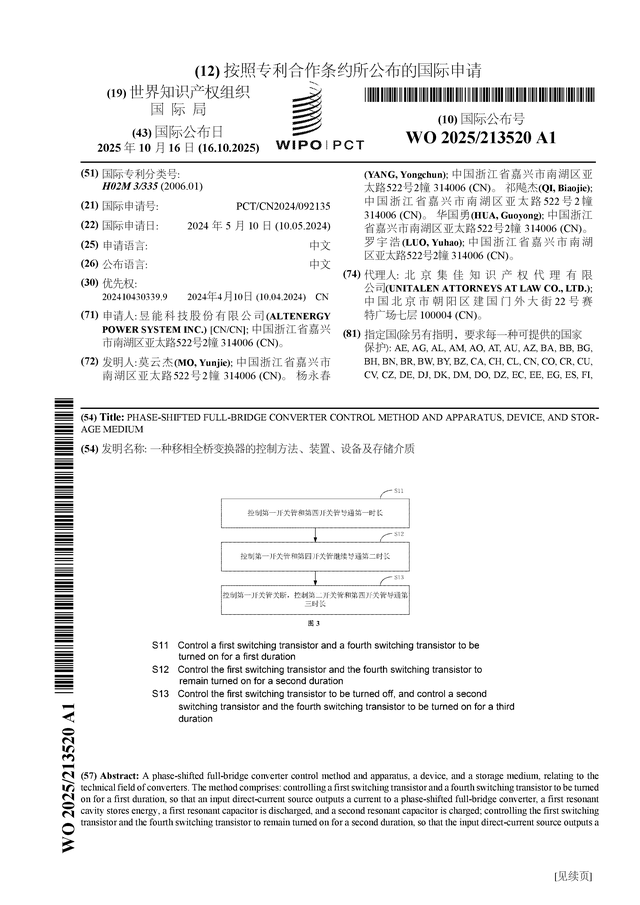 证券之星消息,根据企查查数据显示昱能科技(688348)公布了一项国际专利申请,专利名为“一种移相全桥变换器的控制方法、装置、设备及存储介质”,专利申请号为PCT/CN2024/092135,国际公布日为2025年10月16日。
