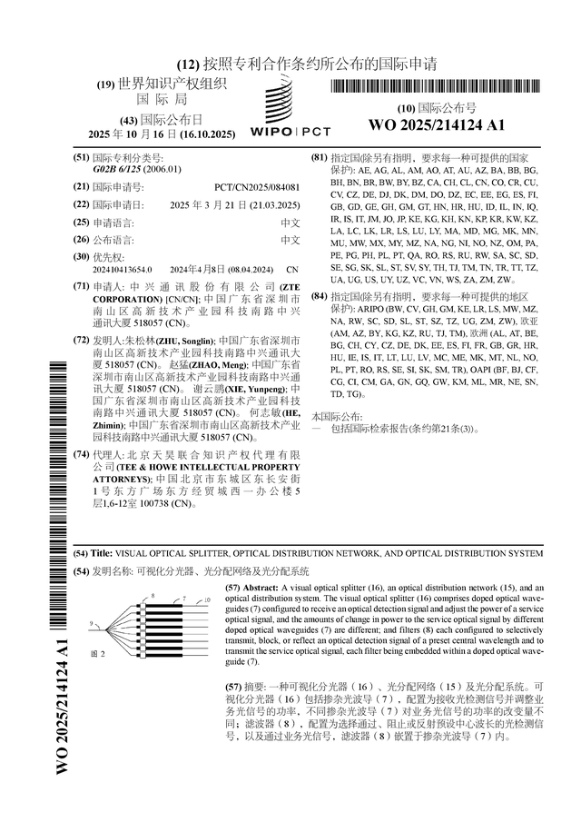 证券之星消息,根据企查查数据显示中兴通讯(000063)公布了一项国际专利申请,专利名为“可视化分光器、光分配网络及光分配系统”,专利申请号为PCT/CN2025/084081,国际公布日为2025年10月16日。