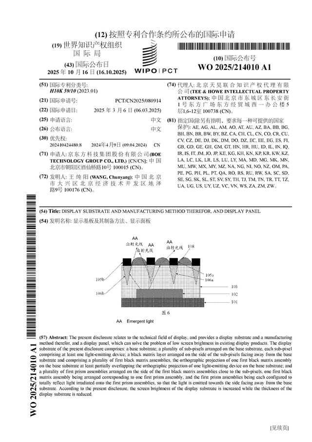 证券之星消息,根据企查查数据显示京东方A(000725)公布了一项国际专利申请,专利名为“显示基板及其制备方法、显示面板”,专利申请号为PCT/CN2025/080914,国际公布日为2025年10月16日。