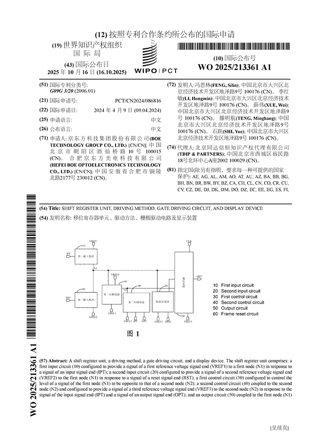 证券之星消息,根据企查查数据显示京东方A(000725)公布了一项国际专利申请,专利名为“移位寄存器单元、驱动方法、栅极驱动电路及显示装置”,专利申请号为PCT/CN2024/086816,国际公布日为2025年10月16日。