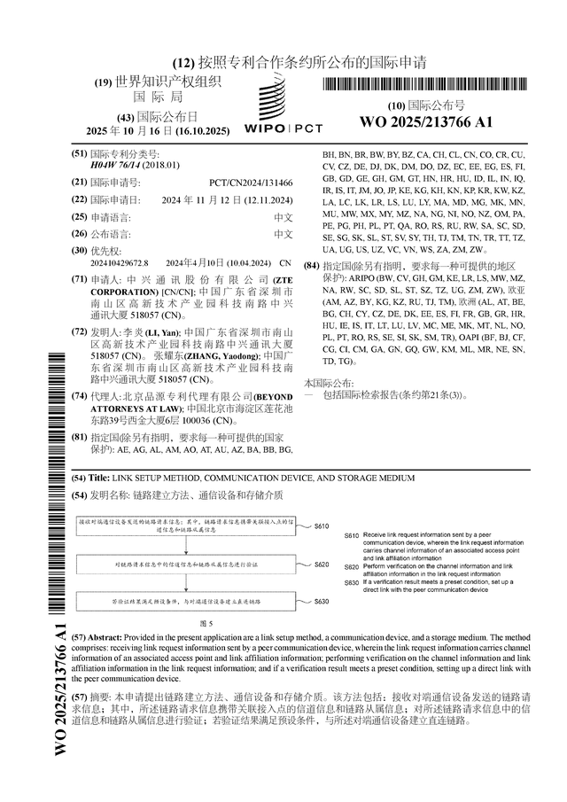 证券之星消息,根据企查查数据显示中兴通讯(000063)公布了一项国际专利申请,专利名为“链路建立方法、通信设备和存储介质”,专利申请号为PCT/CN2024/131466,国际公布日为2025年10月16日。