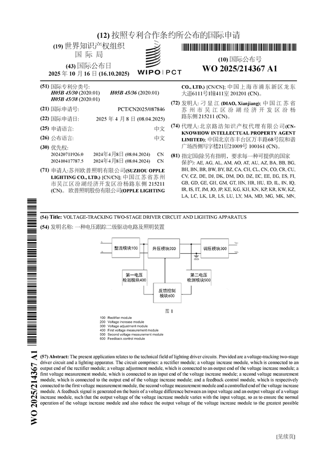 证券之星消息,根据企查查数据显示欧普照明(603515)公布了一项国际专利申请,专利名为“一种电压跟踪二级驱动电路及照明装置”,专利申请号为PCT/CN2025/087846,国际公布日为2025年10月16日。