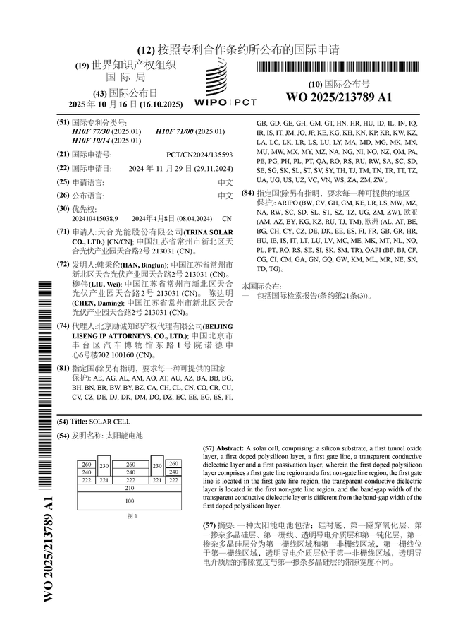 证券之星消息,根据企查查数据显示天合光能(688599)公布了一项国际专利申请,专利名为“太阳能电池”,专利申请号为PCT/CN2024/135593,国际公布日为2025年10月16日。