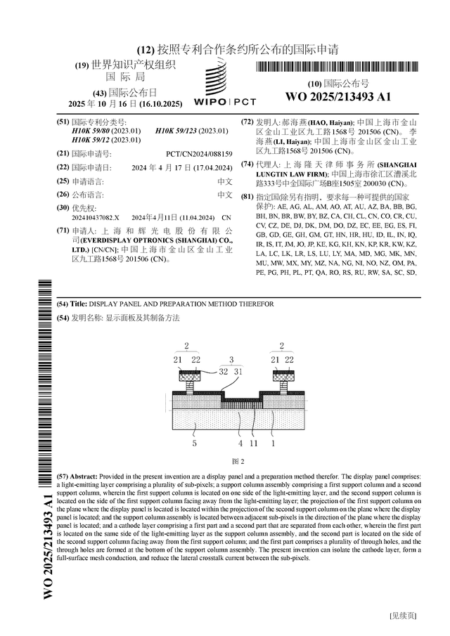 证券之星消息,根据企查查数据显示和辉光电(688538)公布了一项国际专利申请,专利名为“显示面板及其制备方法”,专利申请号为PCT/CN2024/088159,国际公布日为2025年10月16日。