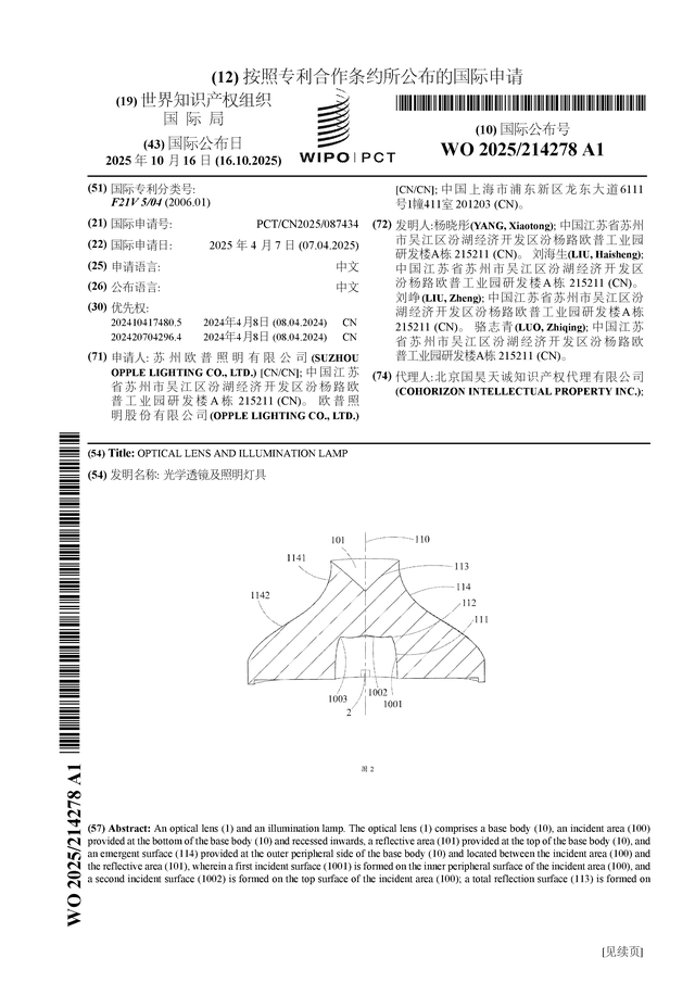 证券之星消息,根据企查查数据显示欧普照明(603515)公布了一项国际专利申请,专利名为“光学透镜及照明灯具”,专利申请号为PCT/CN2025/087434,国际公布日为2025年10月16日。