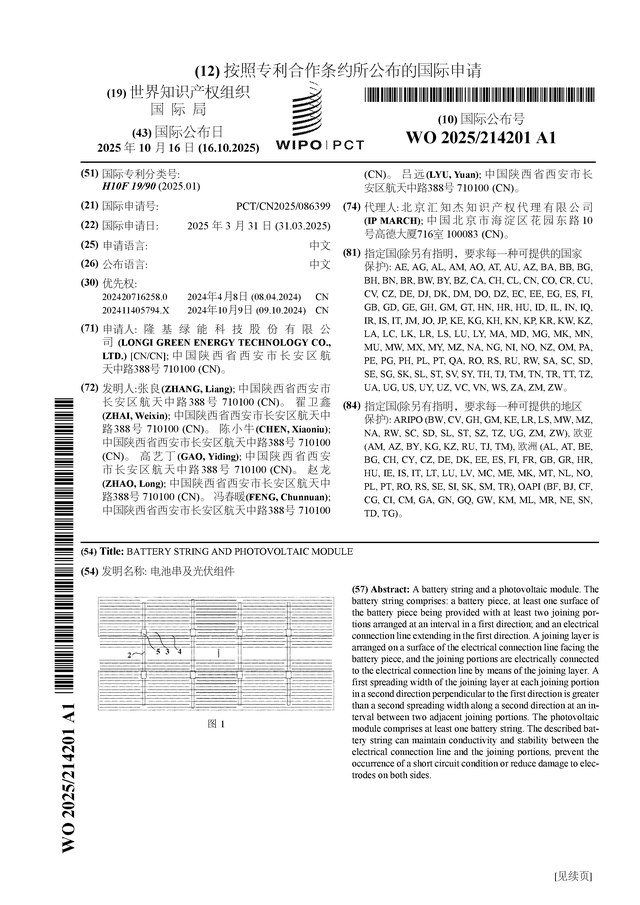 证券之星消息,根据企查查数据显示隆基绿能(601012)公布了一项国际专利申请,专利名为“电池串及光伏组件”,专利申请号为PCT/CN2025/086399,国际公布日为2025年10月16日。