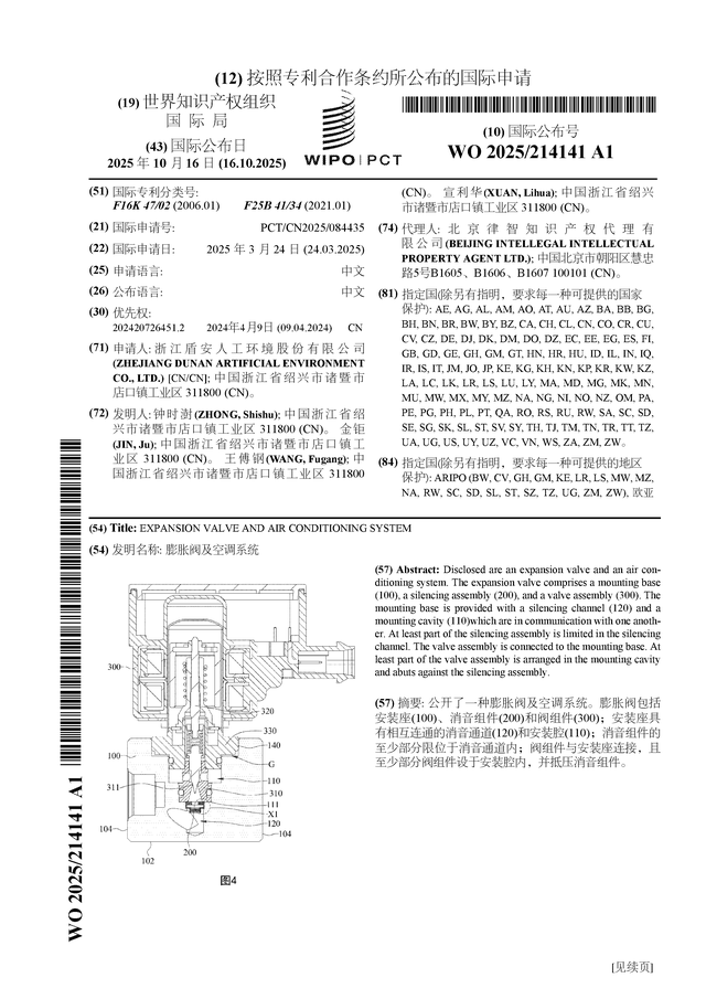 证券之星消息,根据企查查数据显示盾安环境(002011)公布了一项国际专利申请,专利名为“膨胀阀及空调系统”,专利申请号为PCT/CN2025/084435,国际公布日为2025年10月16日。