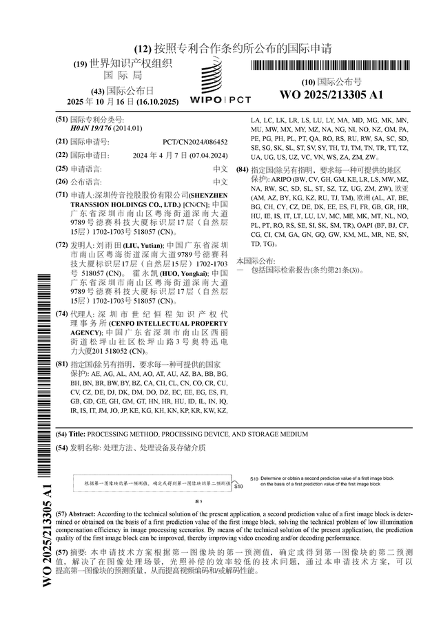 证券之星消息,根据企查查数据显示传音控股(688036)公布了一项国际专利申请,专利名为“处理方法、处理设备及存储介质”,专利申请号为PCT/CN2024/086452,国际公布日为2025年10月16日。