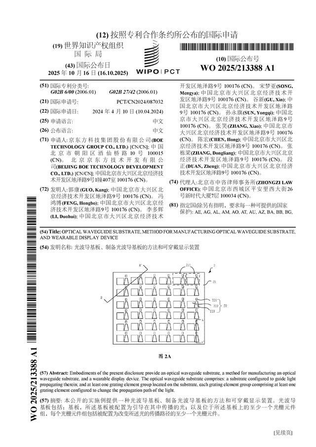 证券之星消息,根据企查查数据显示京东方A(000725)公布了一项国际专利申请,专利名为“光波导基板、制备光波导基板的方法和可穿戴显示装置”,专利申请号为PCT/CN2024/087032,国际公布日为2025年10月16日。