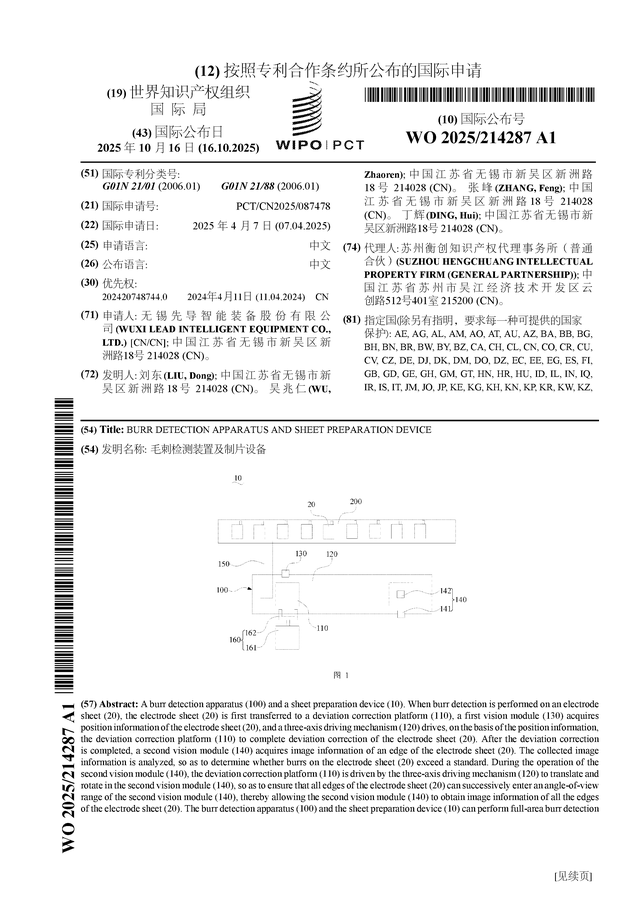 证券之星消息,根据企查查数据显示先导智能(300450)公布了一项国际专利申请,专利名为“毛刺检测装置及制片设备”,专利申请号为PCT/CN2025/087478,国际公布日为2025年10月16日。