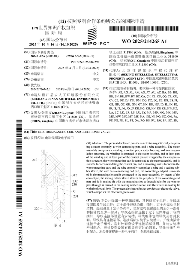 证券之星消息,根据企查查数据显示盾安环境(002011)公布了一项国际专利申请,专利名为“电磁线圈及电子阀门”,专利申请号为PCT/CN2025/087298,国际公布日为2025年10月16日。