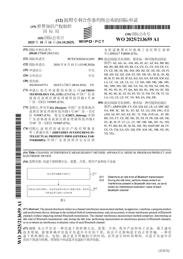 证券之星消息,根据企查查数据显示炬芯科技(688049)公布了一项国际专利申请,专利名为“信道干扰检测方法、装置、介质、程序产品和电子设备”,专利申请号为PCT/CN2024/112493,国际公布日为2025年10月16日。
