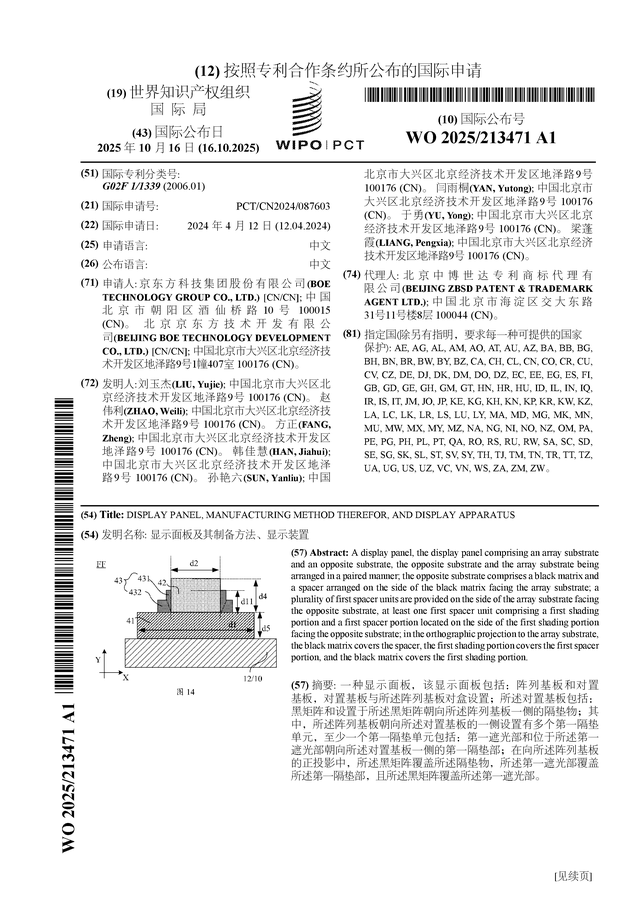 证券之星消息,根据企查查数据显示京东方A(000725)公布了一项国际专利申请,专利名为“显示面板及其制备方法、显示装置”,专利申请号为PCT/CN2024/087603,国际公布日为2025年10月16日。