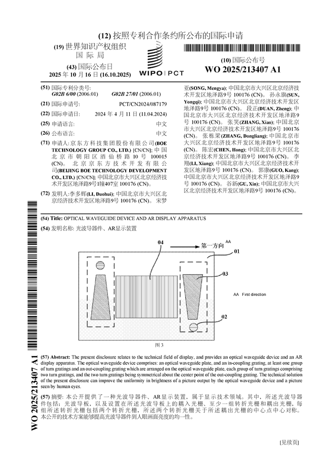 证券之星消息,根据企查查数据显示京东方A(000725)公布了一项国际专利申请,专利名为“光波导器件、AR显示装置”,专利申请号为PCT/CN2024/087179,国际公布日为2025年10月16日。