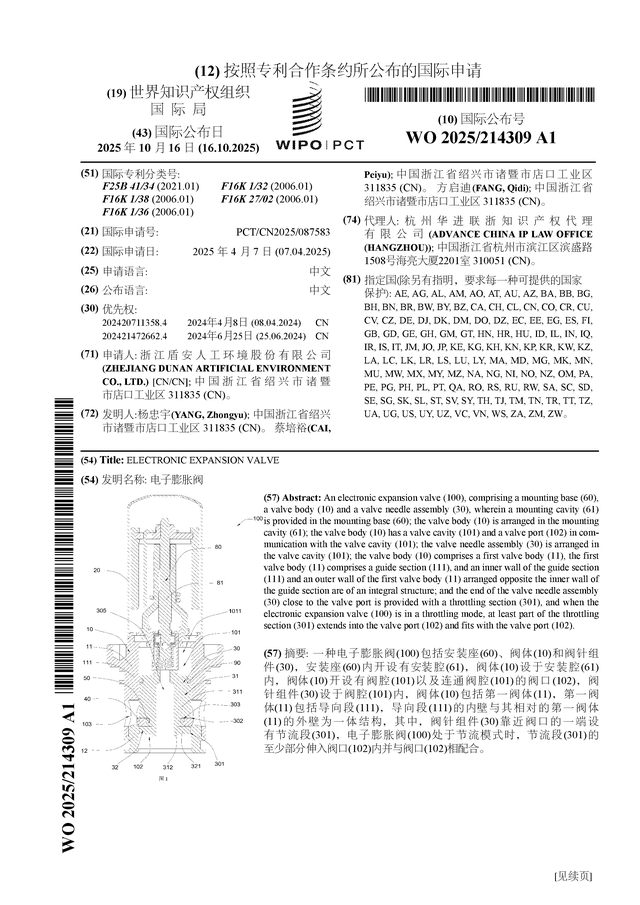 证券之星消息,根据企查查数据显示盾安环境(002011)公布了一项国际专利申请,专利名为“电子膨胀阀”,专利申请号为PCT/CN2025/087583,国际公布日为2025年10月16日。