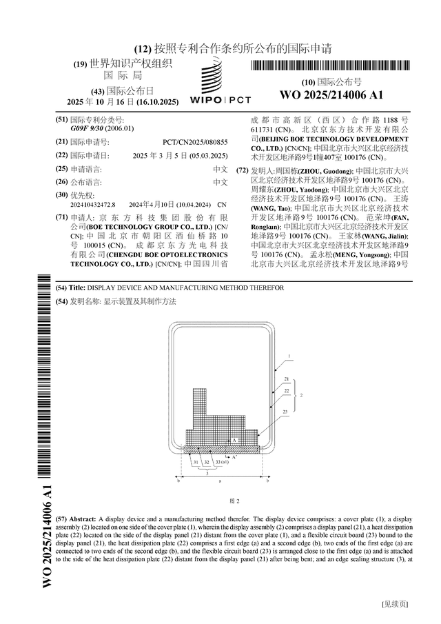 证券之星消息,根据企查查数据显示京东方A(000725)公布了一项国际专利申请,专利名为“显示装置及其制作方法”,专利申请号为PCT/CN2025/080855,国际公布日为2025年10月16日。