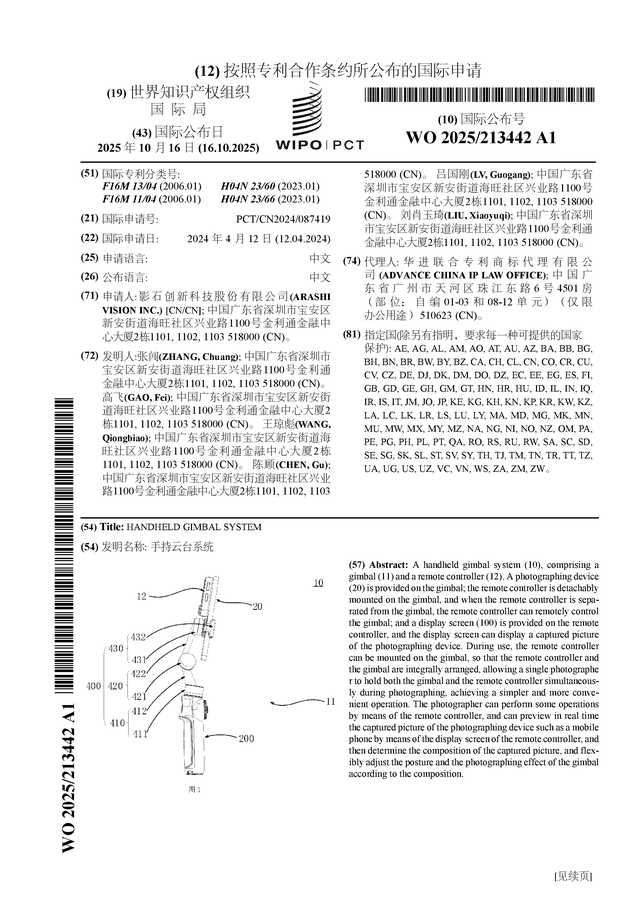 证券之星消息,根据企查查数据显示影石创新(688775)公布了一项国际专利申请,专利名为“手持云台系统”,专利申请号为PCT/CN2024/087419,国际公布日为2025年10月16日。