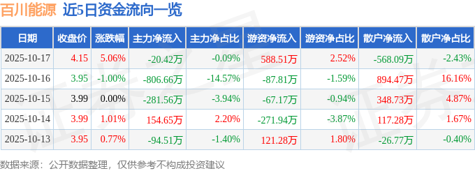 证券之星消息,截至2025年10月17日收盘,百川能源(600681)报收于4.15元,上涨5.06%,换手率4.23%,成交量56.67万手,成交额2.34亿元。