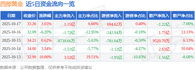 证券之星消息,截至2025年10月17日收盘,西部黄金(601069)报收于33.26元,上涨3.65%,换手率5.82%,成交量51.68万手,成交额17.39亿元。