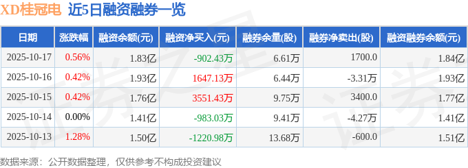 XD桂冠电融资融券信息显示,融资方面,当日融资买入366.4万元,融资偿还1268.83万元,融资净偿还902.43万元。融券方面,融券卖出2000.0股,融券偿还300.0股,融券余量6.61万股,融券余额47.39万元。融资融券余额1.84亿元。