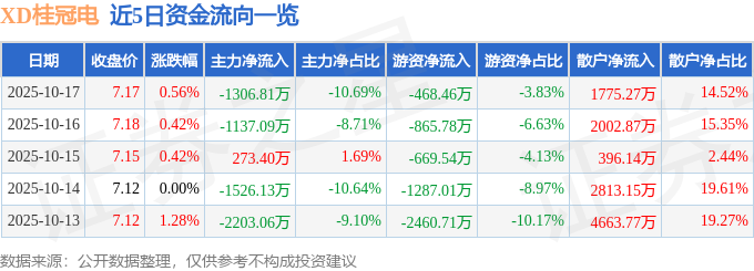 证券之星消息,截至2025年10月17日收盘,XD桂冠电(600236)报收于7.17元,上涨0.56%,换手率0.22%,成交量17.12万手,成交额1.22亿元。