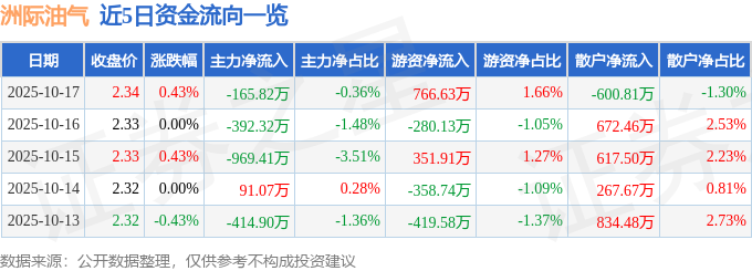 证券之星消息,截至2025年10月17日收盘,洲际油气(600759)报收于2.34元,上涨0.43%,换手率4.75%,成交量196.93万手,成交额4.62亿元。