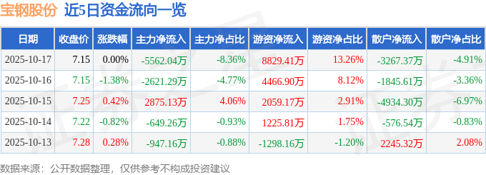 证券之星消息,截至2025年10月17日收盘,宝钢股份(600019)报收于7.15元,上涨0.0%,换手率0.43%,成交量92.66万手,成交额6.66亿元。