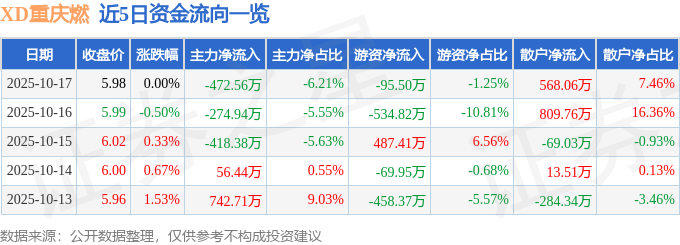 10月17日的资金流向数据方面,主力资金净流出472.56万元,占总成交额6.21%,游资资金净流出95.5万元,占总成交额1.25%,散户资金净流入568.06万元,占总成交额7.46%。
