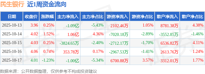 资金流向数据方面,本周民生银行主力资金合计净流出1.38亿元,游资资金合计净流出3896.56万元,散户资金合计净流入1.77亿元。本周资金流向一览见下表: