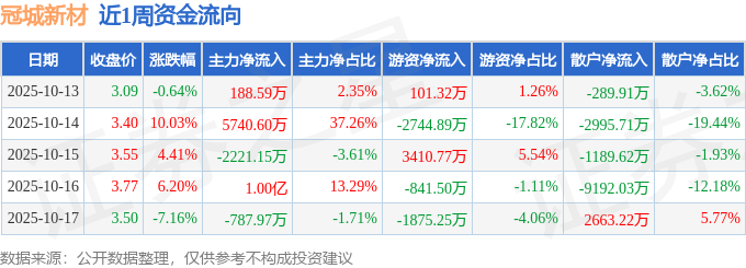 资金流向数据方面,本周冠城新材主力资金合计净流入1.3亿元,游资资金合计净流出1949.54万元,散户资金合计净流出1.1亿元。本周资金流向一览见下表:
