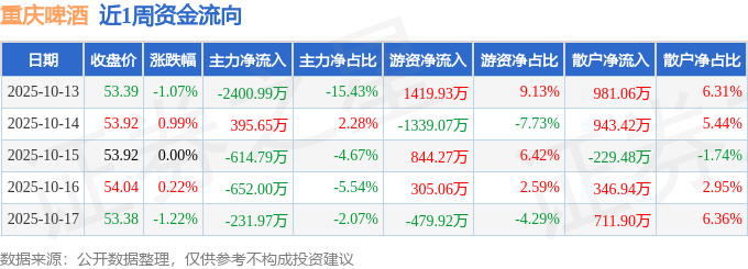 沪深股通持股方面,截止2025年10月17日收盘,重庆啤酒沪股通持股数为3015.31万股,占流通股比为623.0%。
