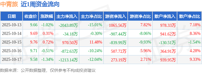 资金流向数据方面,本周中青旅主力资金合计净流出3193.34万元,游资资金合计净流入99.04万元,散户资金合计净流入3094.3万元。本周资金流向一览见下表: