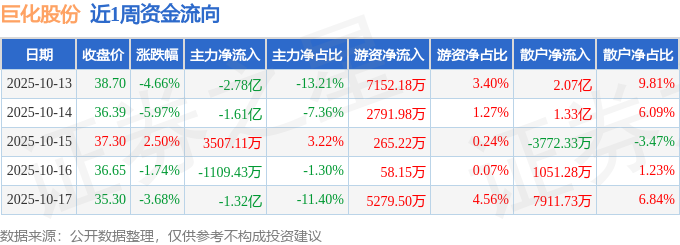 资金流向数据方面,本周巨化股份主力资金合计净流出5.47亿元,游资资金合计净流入1.55亿元,散户资金合计净流入3.92亿元。本周资金流向一览见下表: