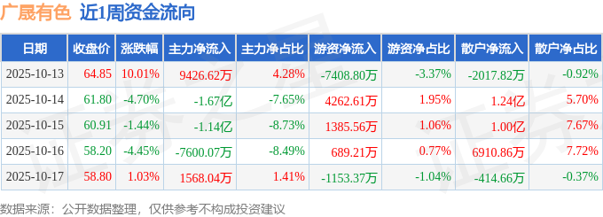 资金流向数据方面,本周广晟有色主力资金合计净流出2.47亿元,游资资金合计净流出2224.78万元,散户资金合计净流入2.69亿元。本周资金流向一览见下表: