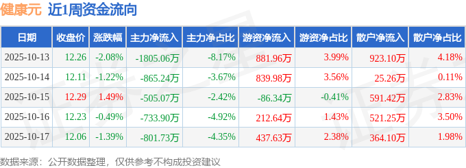 资金流向数据方面,本周健康元主力资金合计净流出4711.0万元,游资资金合计净流入2285.87万元,散户资金合计净流入2425.13万元。本周资金流向一览见下表: