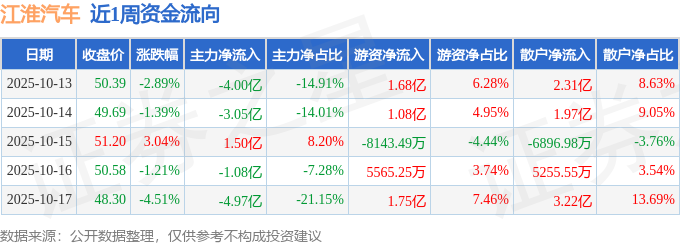 资金流向数据方面,本周江淮汽车主力资金合计净流出11.6亿元,游资资金合计净流入4.26亿元,散户资金合计净流入7.34亿元。本周资金流向一览见下表: