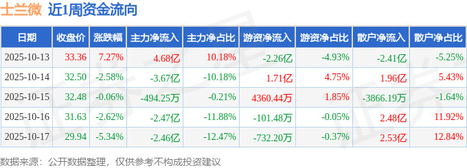 资金流向数据方面,本周士兰微主力资金合计净流出3.97亿元,游资资金合计净流出1987.65万元,散户资金合计净流入4.17亿元。本周资金流向一览见下表: