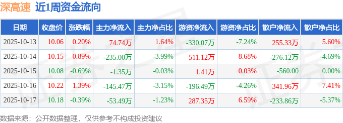 资金流向数据方面,本周深高速主力资金合计净流出360.57万元,游资资金合计净流入273.32万元,散户资金合计净流入87.25万元。本周资金流向一览见下表: