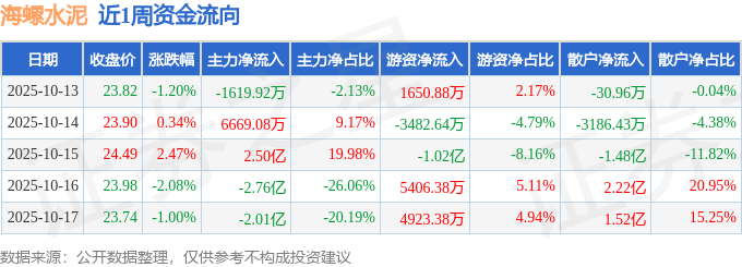 资金流向数据方面,本周海螺水泥主力资金合计净流出1.76亿元,游资资金合计净流出1725.82万元,散户资金合计净流入1.93亿元。本周资金流向一览见下表: