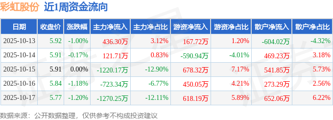 资金流向数据方面,本周彩虹股份主力资金合计净流出2655.75万元,游资资金合计净流入1323.34万元,散户资金合计净流入1332.41万元。本周资金流向一览见下表: