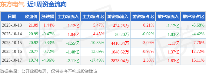 资金流向数据方面,本周东方电气主力资金合计净流出2.98亿元,游资资金合计净流入8717.05万元,散户资金合计净流入2.11亿元。本周资金流向一览见下表: