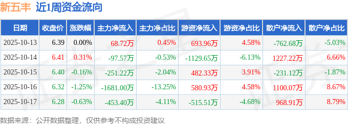 资金流向数据方面,本周新五丰主力资金合计净流出2414.47万元,游资资金合计净流入112.06万元,散户资金合计净流入2302.41万元。本周资金流向一览见下表: