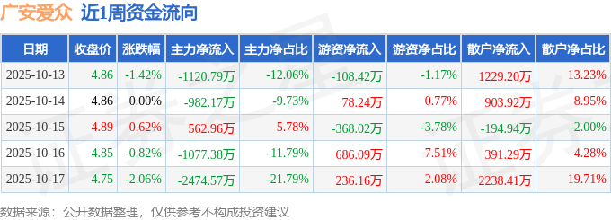 资金流向数据方面,本周广安爱众主力资金合计净流出5091.94万元,游资资金合计净流入524.05万元,散户资金合计净流入4567.89万元。本周资金流向一览见下表:
