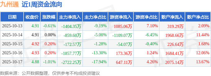 资金流向数据方面,本周九州通主力资金合计净流出7016.53万元,游资资金合计净流入742.39万元,散户资金合计净流入6274.14万元。本周资金流向一览见下表: