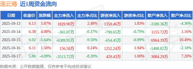 资金流向数据方面,本周连云港主力资金合计净流出8202.26万元,游资资金合计净流入1587.02万元,散户资金合计净流入6615.24万元。本周资金流向一览见下表: