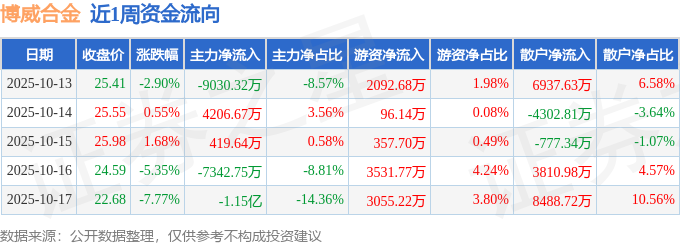 资金流向数据方面,本周博威合金主力资金合计净流出2.33亿元,游资资金合计净流入9133.51万元,散户资金合计净流入1.42亿元。本周资金流向一览见下表: