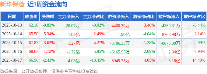 资金流向数据方面,本周新华保险主力资金合计净流出3.52亿元,游资资金合计净流出1.56亿元,散户资金合计净流入5.07亿元。本周资金流向一览见下表: