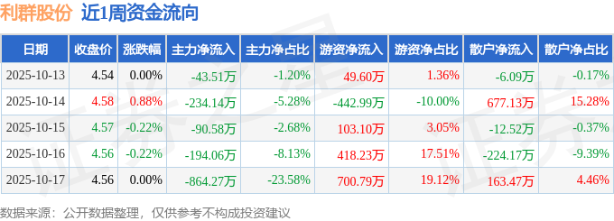 资金流向数据方面,本周利群股份主力资金合计净流出1426.56万元,游资资金合计净流入828.73万元,散户资金合计净流入597.82万元。本周资金流向一览见下表:
